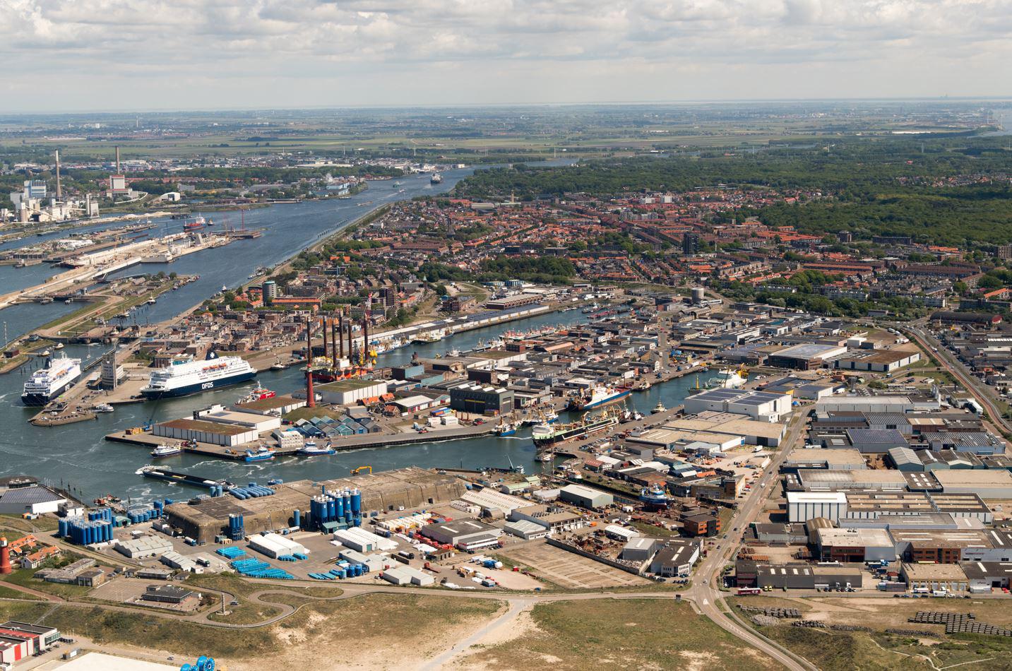 Luchtfoto van een bedrijventerrein in de IJmond.