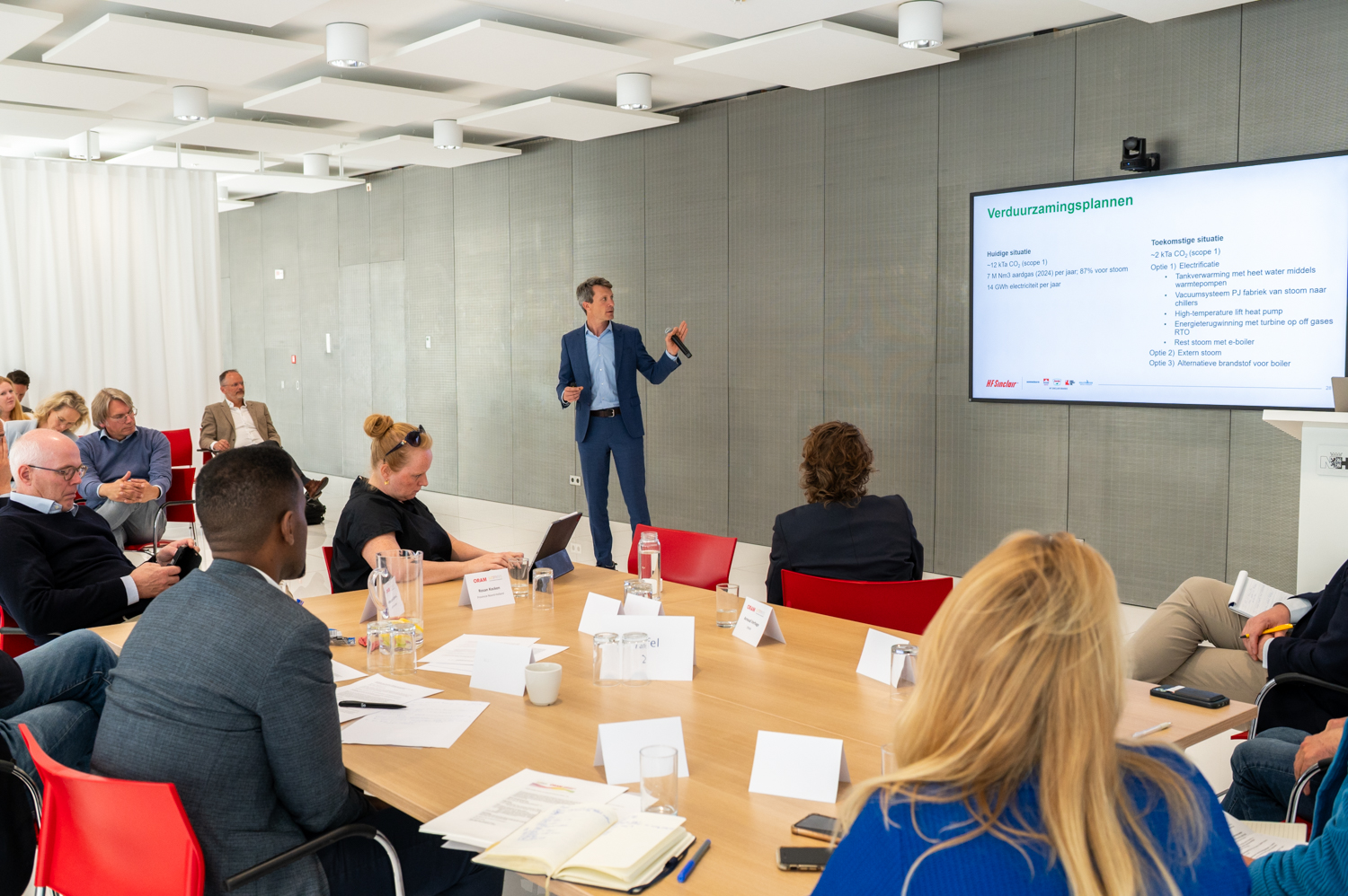 Bedrijven als OFI, Crown van Gelder en Sonneborn deelden praktijkvoorbeelden van hoe zij verduurzamen en waar ze tegenaan lopen. Netcongestie blokkeert elektrificatie en bedrijven hebben te maken met tegenstrijdige regelgeving en lange vergunningprocedures. Ook de hoge energie- en netwerkkosten maken dat investeringen steeds moeilijker rond te rekenen zijn.