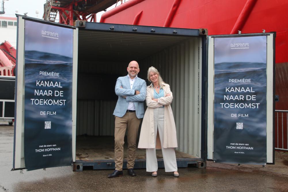Tijdens de Havenfestivalborrel in IJmuiden opende de Velsense wethouder Jeroen Verwoort samen met de directeur van het Programmabureau NZKG Lousanne Boeijen op vrijdag 21 juni de zeecontainer waarin de korte film ‘Kanaal naar de toekomst’ over het Noordzeekanaalgebied in première is gegaan. Met deze film presenteert het Noordzeekanaalgebied zich voor het eerst aan het grote publiek.