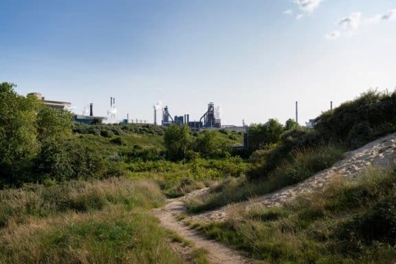 Duingebied met fabrieken Tata Steel op de achtergrond