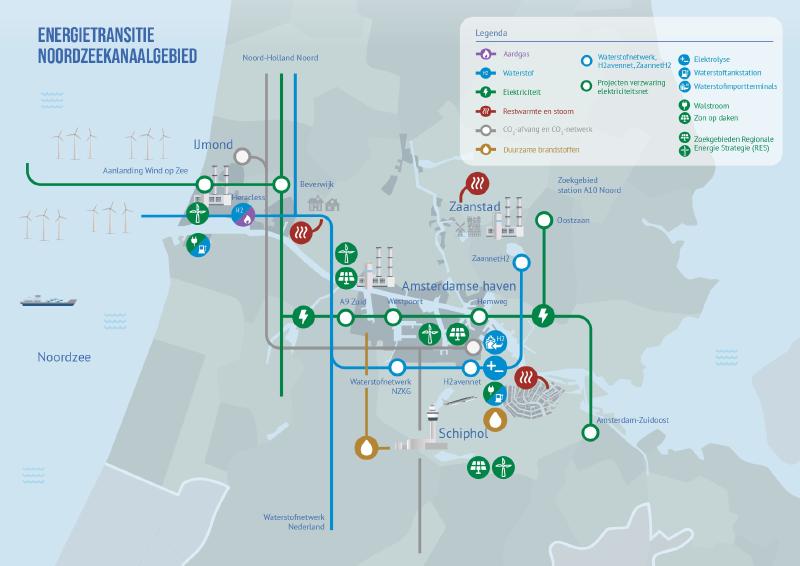 Overzicht van de waterstofprojecten in het Noord-Holland. Klik op de afbeelding voor een grote weergave.